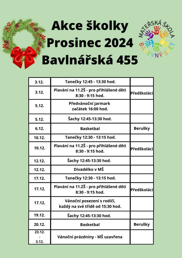 Akce mateřské školy Bavlnářská 455 na měsíc Prosinec Autor: Barbora WranikováDne 29 listopadu, 2024V Berušky, Květinky, Pro rodiče, Sluníčka