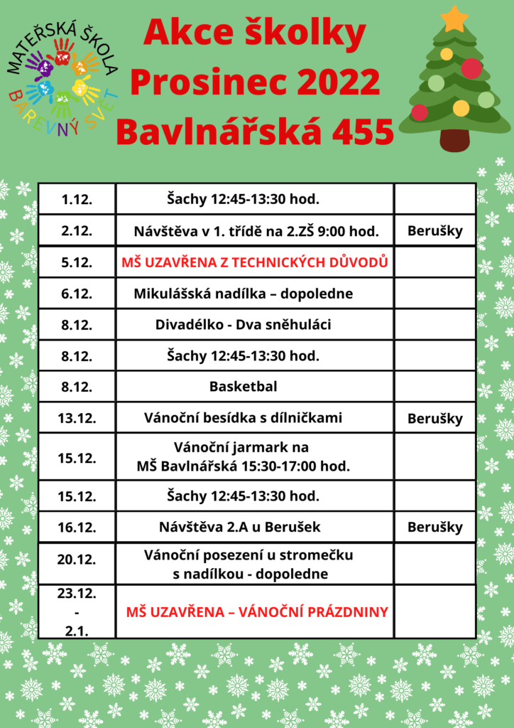 Akce mateřské školy Bavlnářská 455 na měsíc Prosinec