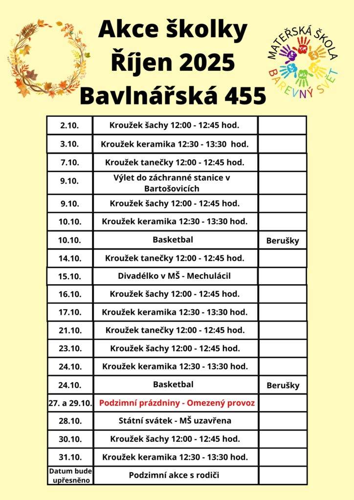 Akce mateřské školy Bavlnářská 455 na měsíc Říjen Autor: Barbora WranikováDne 1 října, 2025V Berušky, Květinky, Pro rodiče, Sluníčka