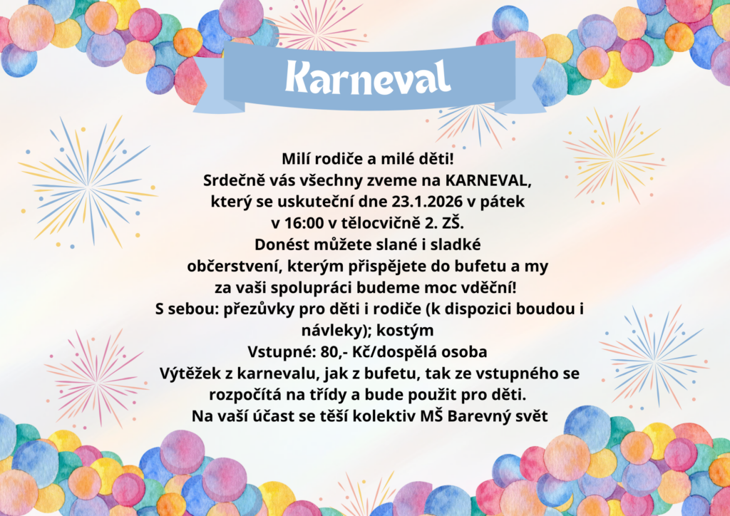 Karneval 23.1. Autor: Barbora WranikováDne 6 ledna, 2026V Berušky, Koťátka, Kuřátka, Květinky, Motýlci, Myšky, Pro rodiče, Sluníčka, Sovičky