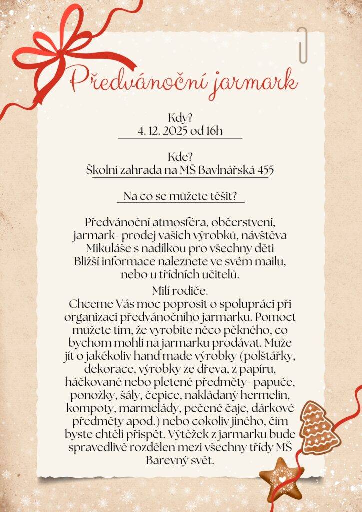 Předvánoční jarmark 2025 Autor: Barbora WranikováDne 30 října, 2025V Berušky, Koťátka, Kuřátka, Květinky, Motýlci, Myšky, Pro rodiče, Sluníčka, Sovičky