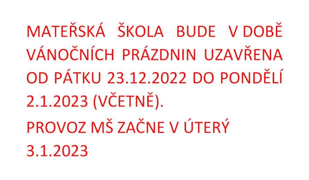 Uzavření Mateřské školy přes Vánoce Autor: Ervin DžekovičDne 21 prosince, 2022V Berušky, Koťátka, Kuřátka, Květinky, Motýlci, Myšky, Pro rodiče, Sluníčka, Sovičky