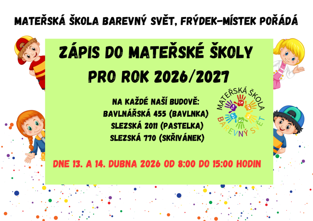 Zápis do MŠ pro rok 2026/2027 Autor: Barbora WranikováDne 27 ledna, 2026V Berušky, Koťátka, Kuřátka, Květinky, Motýlci, Myšky, Pro rodiče, Sluníčka, Sovičky