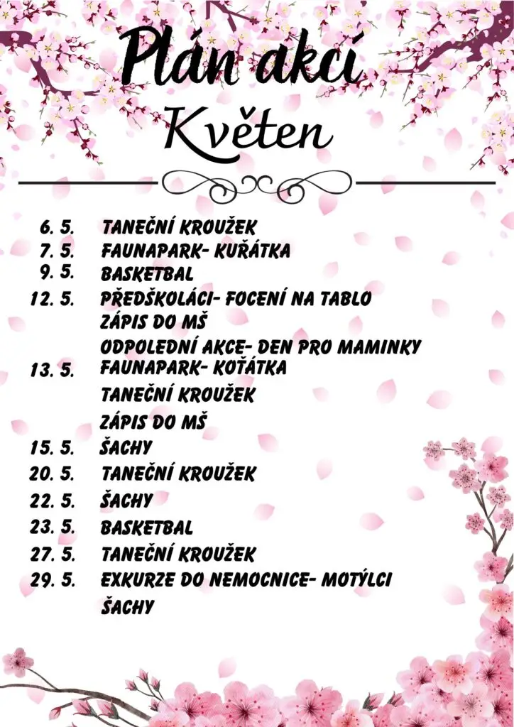 Akce mateřské školy Slezská 770 na měsíc Květen 2025 Autor: Kristýna NávratováDne 5 května, 2025V Koťátka, Kuřátka, Motýlci, Pro rodiče