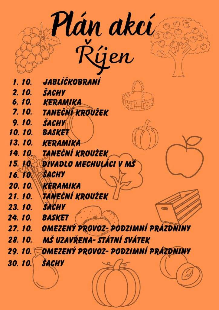 Akce mateřské školy Slezská 770 na měsíc Říjen 2025 Autor: Kristýna NávratováDne 1 října, 2025V Koťátka, Kuřátka, Motýlci, Pro rodiče