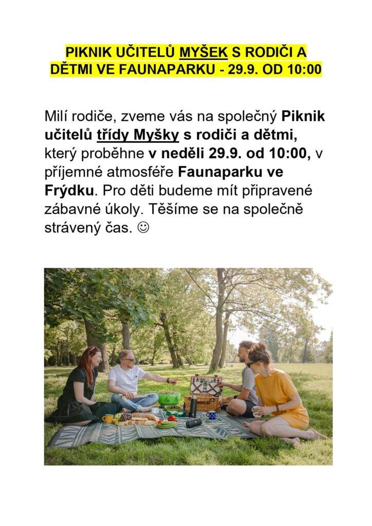 Třída Myšky – Piknik s učiteli, rodiči a dětmi ve Faunaparku – neděle 29.9.2024 od 10:00 Autor: Ervin DžekovičDne 26 září, 2024V Myšky, Pro rodiče, Sovičky
