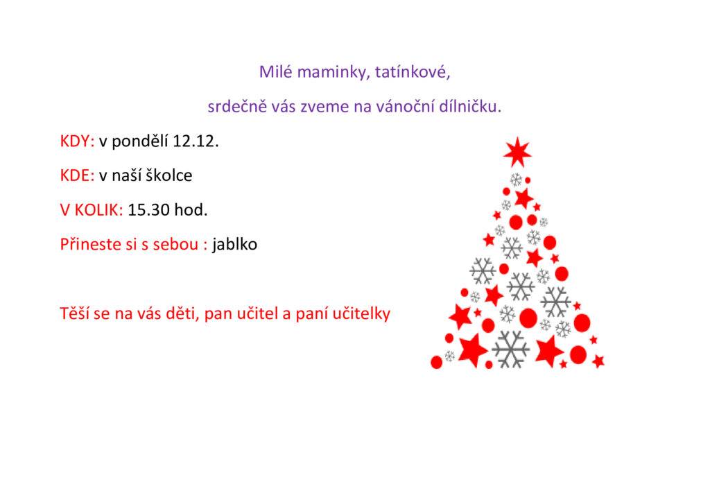12. prosince od 15:30 – Vánoční dílny s rodiči – MŠ Slezská 2011 Autor: Ervin DžekovičDne 7 prosince, 2022V Myšky, Pro rodiče, Sovičky